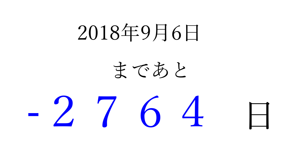 2018年9月6日(木)は もう 0000 日過ぎました 追加すると、トップページからすぐ選べるようになります ※2026/04/01現在の結果です。 最新の状態に更新する ↓シェアして、タイムライン上にカウントダウンを表示しよう!↓ 📤 この結果を共有する Tweet シェア Threads Bluesky 別の日付でカウントダウン 2018年9月のカレンダー このページをブックマークに追加すると、いつでもカウントダウンを確認できます。 (PC: Ctrl+D / Mac: ⌘+D) hitome-notes.comでは以下のページも運営しています。 指定日と期間から日付を計算 | ガチャ確率計算・シミュレーション | プライバシー・ポリシー 運営者:Avocado