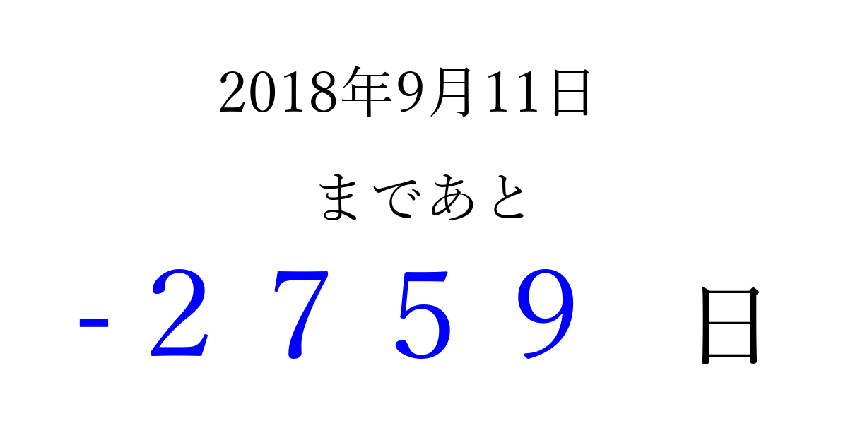 2018年9月11日(火)は もう 0000 日過ぎました 追加すると、トップページからすぐ選べるようになります ※2026/04/01現在の結果です。 最新の状態に更新する ↓シェアして、タイムライン上にカウントダウンを表示しよう!↓ 📤 この結果を共有する Tweet シェア Threads Bluesky 別の日付でカウントダウン 2018年9月のカレンダー このページをブックマークに追加すると、いつでもカウントダウンを確認できます。 (PC: Ctrl+D / Mac: ⌘+D) hitome-notes.comでは以下のページも運営しています。 指定日と期間から日付を計算 | ガチャ確率計算・シミュレーション | プライバシー・ポリシー 運営者:Avocado