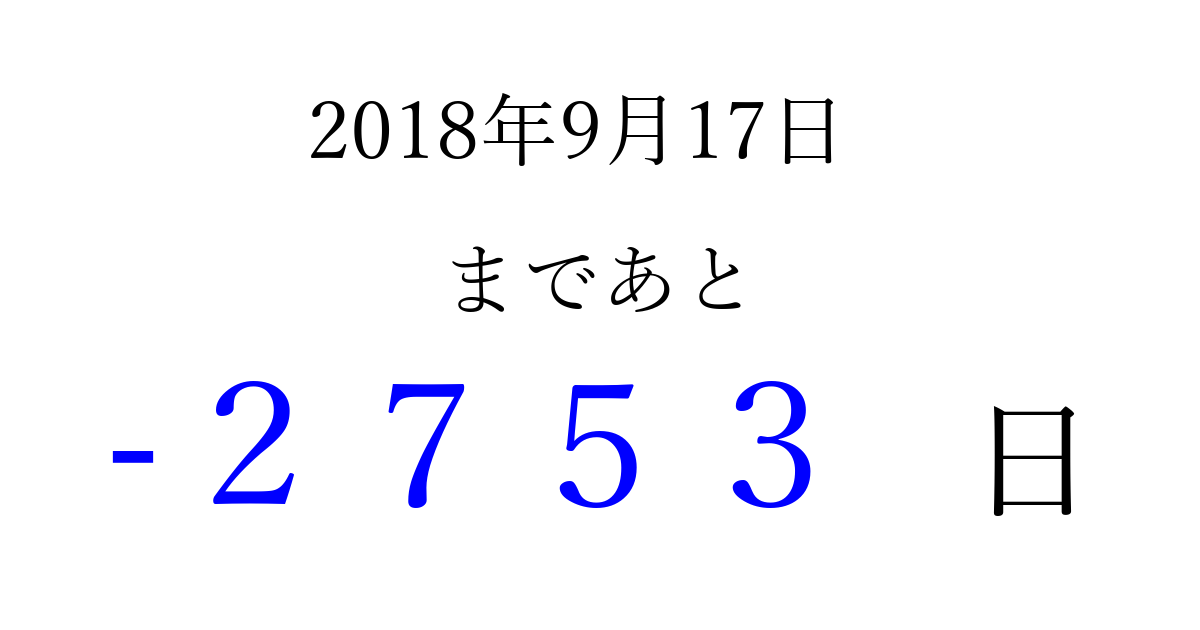 2018年9月17日(月)は もう 0000 日過ぎました 追加すると、トップページからすぐ選べるようになります ※2026/04/01現在の結果です。 最新の状態に更新する ↓シェアして、タイムライン上にカウントダウンを表示しよう!↓ 📤 この結果を共有する Tweet シェア Threads Bluesky この日は何の日?敬老の日 別の日付でカウントダウン 2018年9月のカレンダー このページをブックマークに追加すると、いつでもカウントダウンを確認できます。 (PC: Ctrl+D / Mac: ⌘+D) hitome-notes.comでは以下のページも運営しています。 指定日と期間から日付を計算 | ガチャ確率計算・シミュレーション | プライバシー・ポリシー 運営者:Avocado