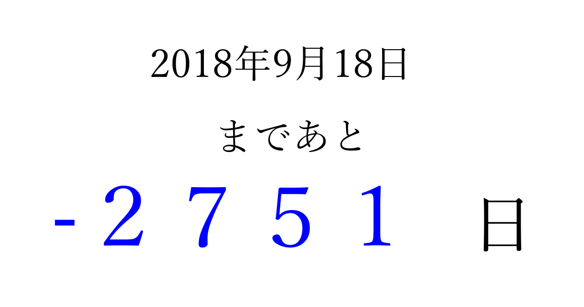 2018年9月18日(火)は もう 0000 日過ぎました 追加すると、トップページからすぐ選べるようになります ※2026/03/31現在の結果です。 最新の状態に更新する ↓シェアして、タイムライン上にカウントダウンを表示しよう!↓ 📤 この結果を共有する Tweet シェア Threads Bluesky 別の日付でカウントダウン 2018年9月のカレンダー このページをブックマークに追加すると、いつでもカウントダウンを確認できます。 (PC: Ctrl+D / Mac: ⌘+D) hitome-notes.comでは以下のページも運営しています。 指定日と期間から日付を計算 | ガチャ確率計算・シミュレーション | プライバシー・ポリシー 運営者:Avocado