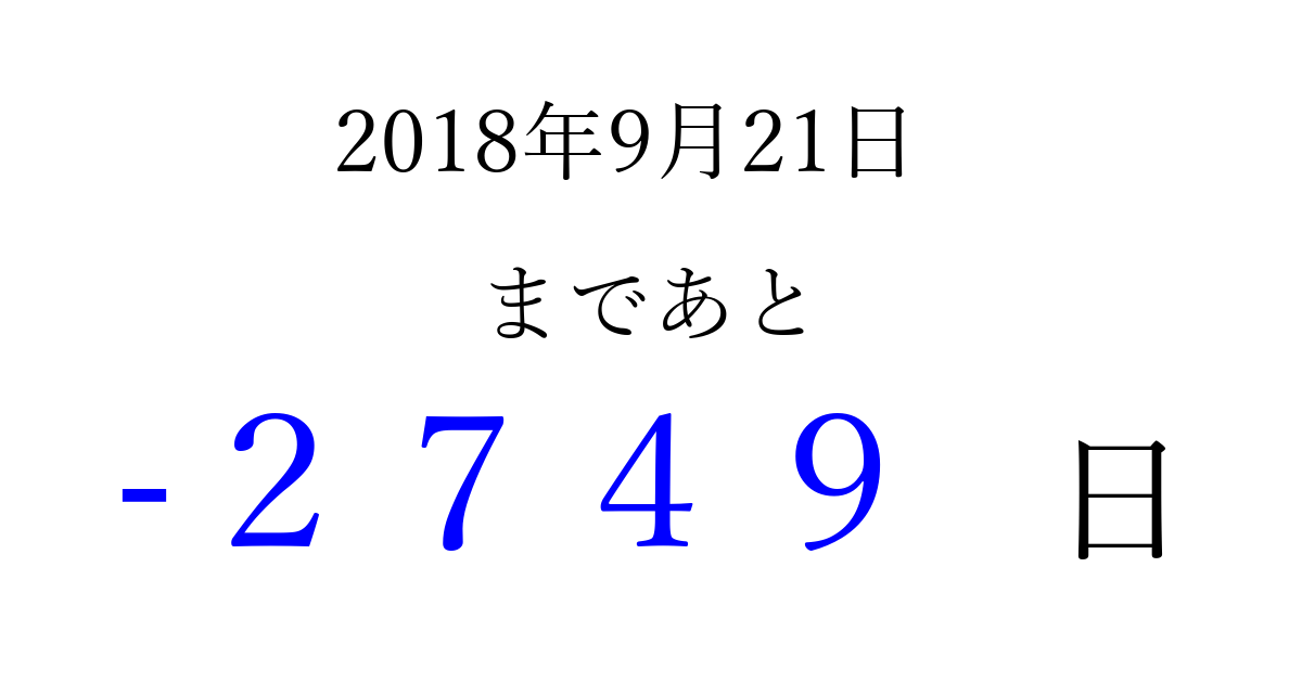 2018年9月21日(金)は もう 0000 日過ぎました 追加すると、トップページからすぐ選べるようになります ※2026/04/01現在の結果です。 最新の状態に更新する ↓シェアして、タイムライン上にカウントダウンを表示しよう!↓ 📤 この結果を共有する Tweet シェア Threads Bluesky 別の日付でカウントダウン 2018年9月のカレンダー このページをブックマークに追加すると、いつでもカウントダウンを確認できます。 (PC: Ctrl+D / Mac: ⌘+D) hitome-notes.comでは以下のページも運営しています。 指定日と期間から日付を計算 | ガチャ確率計算・シミュレーション | プライバシー・ポリシー 運営者:Avocado