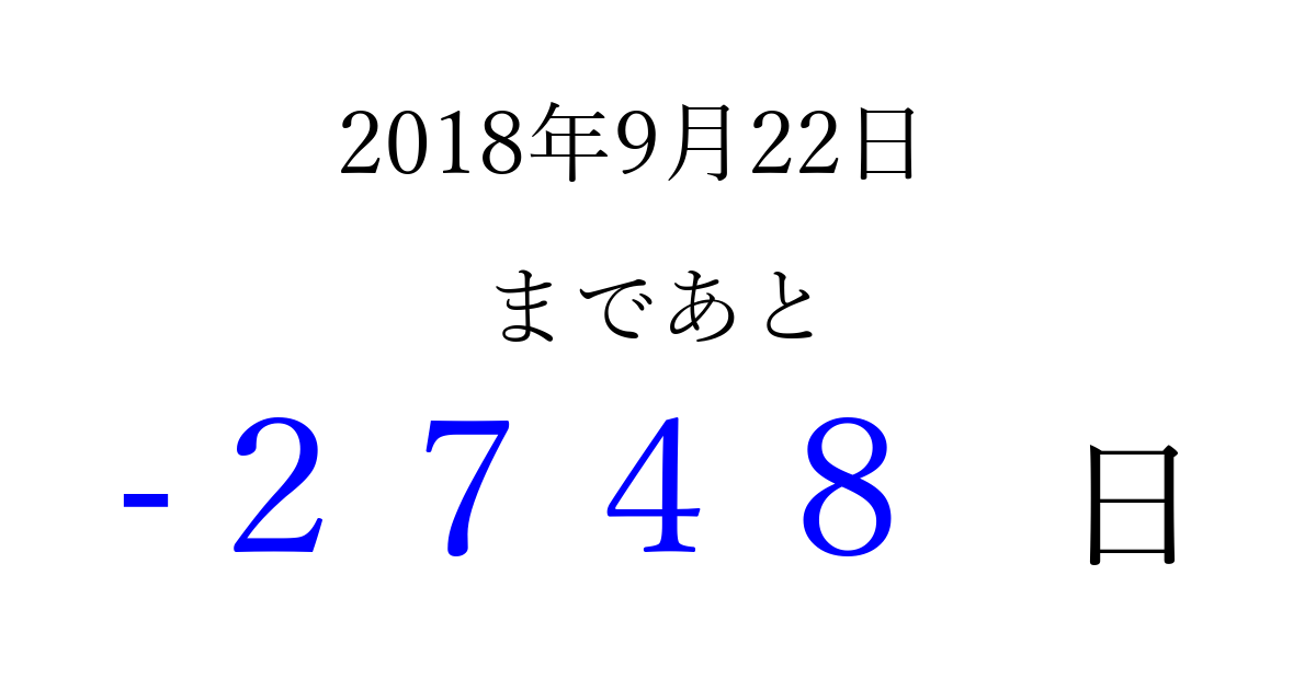 2018年9月22日(土)は もう 0000 日過ぎました 追加すると、トップページからすぐ選べるようになります ※2026/04/01現在の結果です。 最新の状態に更新する ↓シェアして、タイムライン上にカウントダウンを表示しよう!↓ 📤 この結果を共有する Tweet シェア Threads Bluesky 別の日付でカウントダウン 2018年9月のカレンダー このページをブックマークに追加すると、いつでもカウントダウンを確認できます。 (PC: Ctrl+D / Mac: ⌘+D) hitome-notes.comでは以下のページも運営しています。 指定日と期間から日付を計算 | ガチャ確率計算・シミュレーション | プライバシー・ポリシー 運営者:Avocado