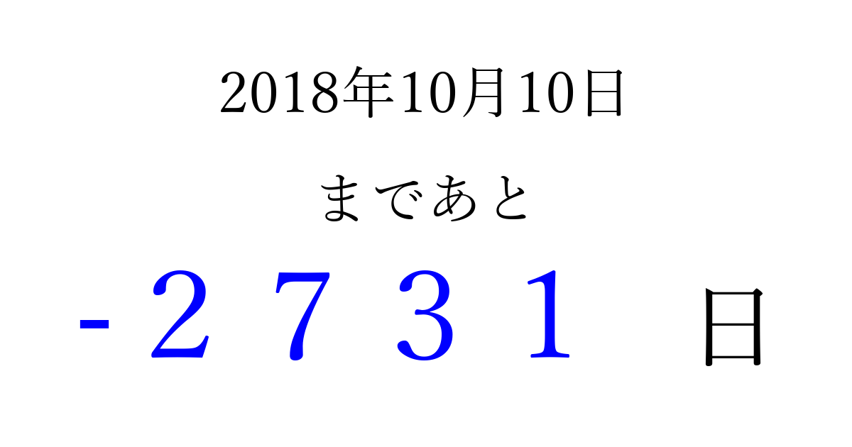 2018年10月10日(水)は もう 0000 日過ぎました 追加すると、トップページからすぐ選べるようになります ※2026/04/02現在の結果です。 最新の状態に更新する ↓シェアして、タイムライン上にカウントダウンを表示しよう!↓ 📤 この結果を共有する Tweet シェア Threads Bluesky 別の日付でカウントダウン 2018年10月のカレンダー このページをブックマークに追加すると、いつでもカウントダウンを確認できます。 (PC: Ctrl+D / Mac: ⌘+D) hitome-notes.comでは以下のページも運営しています。 指定日と期間から日付を計算 | ガチャ確率計算・シミュレーション | プライバシー・ポリシー 運営者:Avocado