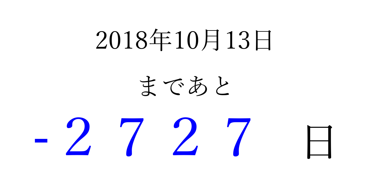 2018年10月13日(土)は もう 0000 日過ぎました 追加すると、トップページからすぐ選べるようになります ※2026/04/01現在の結果です。 最新の状態に更新する ↓シェアして、タイムライン上にカウントダウンを表示しよう!↓ 📤 この結果を共有する Tweet シェア Threads Bluesky 別の日付でカウントダウン 2018年10月のカレンダー このページをブックマークに追加すると、いつでもカウントダウンを確認できます。 (PC: Ctrl+D / Mac: ⌘+D) hitome-notes.comでは以下のページも運営しています。 指定日と期間から日付を計算 | ガチャ確率計算・シミュレーション | プライバシー・ポリシー 運営者:Avocado