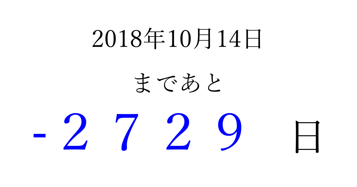 2018年10月14日(日)は もう 0000 日過ぎました 追加すると、トップページからすぐ選べるようになります ※2026/04/04現在の結果です。 最新の状態に更新する ↓シェアして、タイムライン上にカウントダウンを表示しよう!↓ 📤 この結果を共有する Tweet シェア Threads Bluesky 別の日付でカウントダウン 2018年10月のカレンダー このページをブックマークに追加すると、いつでもカウントダウンを確認できます。 (PC: Ctrl+D / Mac: ⌘+D) hitome-notes.comでは以下のページも運営しています。 指定日と期間から日付を計算 | ガチャ確率計算・シミュレーション | プライバシー・ポリシー 運営者:Avocado