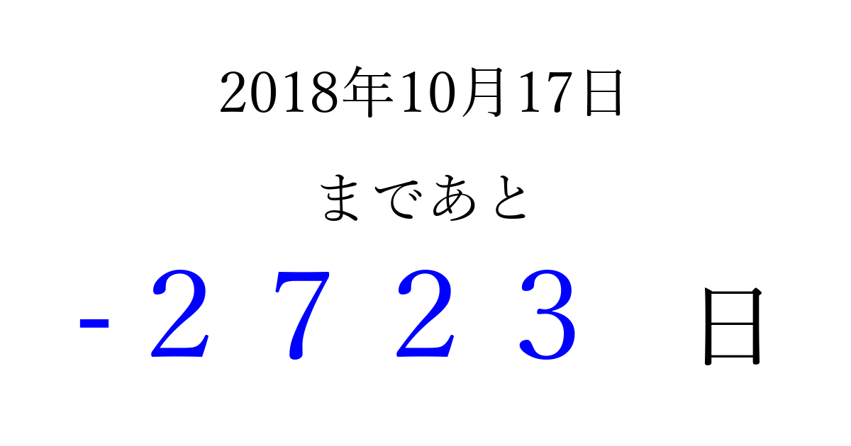 2018年10月17日(水)は もう 0000 日過ぎました 追加すると、トップページからすぐ選べるようになります ※2026/04/01現在の結果です。 最新の状態に更新する ↓シェアして、タイムライン上にカウントダウンを表示しよう!↓ 📤 この結果を共有する Tweet シェア Threads Bluesky 別の日付でカウントダウン 2018年10月のカレンダー このページをブックマークに追加すると、いつでもカウントダウンを確認できます。 (PC: Ctrl+D / Mac: ⌘+D) hitome-notes.comでは以下のページも運営しています。 指定日と期間から日付を計算 | ガチャ確率計算・シミュレーション | プライバシー・ポリシー 運営者:Avocado
