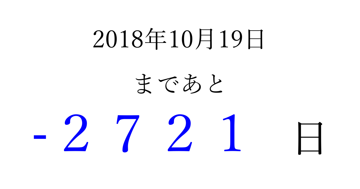 2018年10月19日(金)は もう 0000 日過ぎました 追加すると、トップページからすぐ選べるようになります ※2026/04/01現在の結果です。 最新の状態に更新する ↓シェアして、タイムライン上にカウントダウンを表示しよう!↓ 📤 この結果を共有する Tweet シェア Threads Bluesky 別の日付でカウントダウン 2018年10月のカレンダー このページをブックマークに追加すると、いつでもカウントダウンを確認できます。 (PC: Ctrl+D / Mac: ⌘+D) hitome-notes.comでは以下のページも運営しています。 指定日と期間から日付を計算 | ガチャ確率計算・シミュレーション | プライバシー・ポリシー 運営者:Avocado