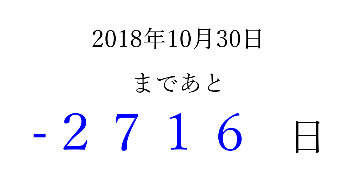 2018年10月30日(火)は もう 0000 日過ぎました 追加すると、トップページからすぐ選べるようになります ※2026/04/07現在の結果です。 最新の状態に更新する ↓シェアして、タイムライン上にカウントダウンを表示しよう!↓ 📤 この結果を共有する Tweet シェア Threads Bluesky 別の日付でカウントダウン 2018年10月のカレンダー このページをブックマークに追加すると、いつでもカウントダウンを確認できます。 (PC: Ctrl+D / Mac: ⌘+D) hitome-notes.comでは以下のページも運営しています。 指定日と期間から日付を計算 | ガチャ確率計算・シミュレーション | プライバシー・ポリシー 運営者:Avocado