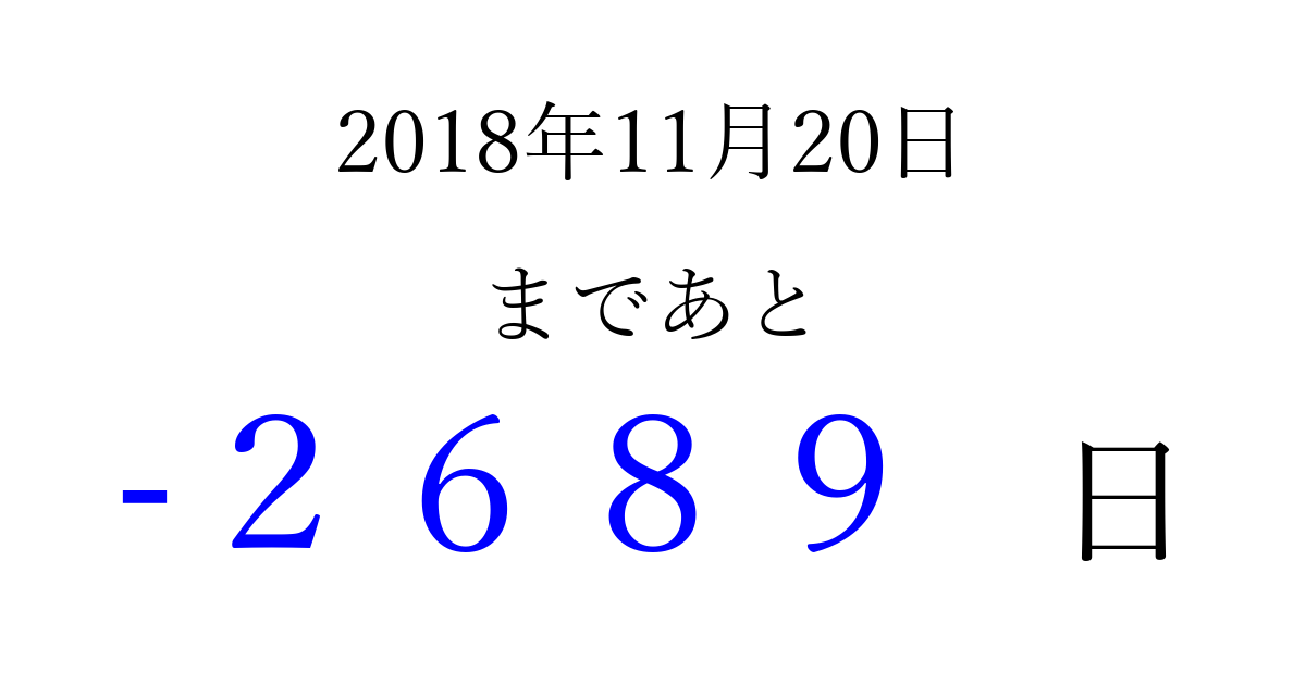 2018年11月20日(火)は もう 0000 日過ぎました 追加すると、トップページからすぐ選べるようになります ※2026/04/01現在の結果です。 最新の状態に更新する ↓シェアして、タイムライン上にカウントダウンを表示しよう!↓ 📤 この結果を共有する Tweet シェア Threads Bluesky 別の日付でカウントダウン 2018年11月のカレンダー このページをブックマークに追加すると、いつでもカウントダウンを確認できます。 (PC: Ctrl+D / Mac: ⌘+D) hitome-notes.comでは以下のページも運営しています。 指定日と期間から日付を計算 | ガチャ確率計算・シミュレーション | プライバシー・ポリシー 運営者:Avocado