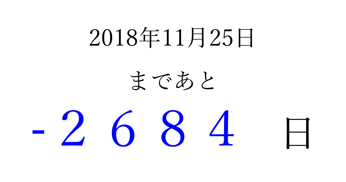 2018年11月25日(日)は もう 0000 日過ぎました 追加すると、トップページからすぐ選べるようになります ※2026/04/01現在の結果です。 最新の状態に更新する ↓シェアして、タイムライン上にカウントダウンを表示しよう!↓ 📤 この結果を共有する Tweet シェア Threads Bluesky 別の日付でカウントダウン 2018年11月のカレンダー このページをブックマークに追加すると、いつでもカウントダウンを確認できます。 (PC: Ctrl+D / Mac: ⌘+D) hitome-notes.comでは以下のページも運営しています。 指定日と期間から日付を計算 | ガチャ確率計算・シミュレーション | プライバシー・ポリシー 運営者:Avocado