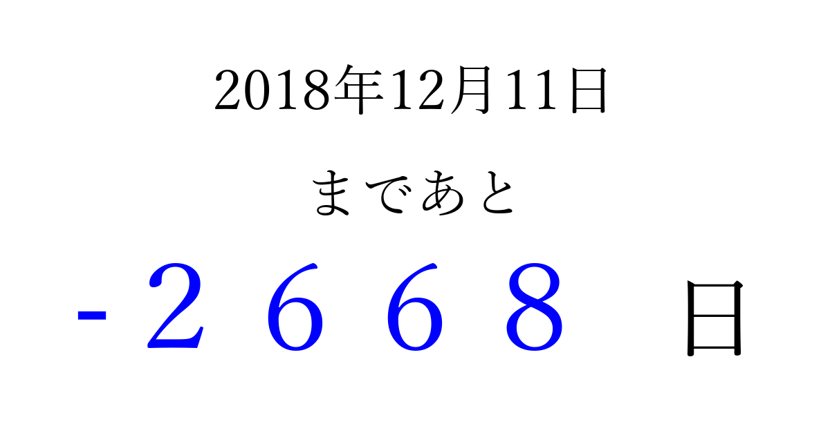 2018年12月11日(火)は もう 0000 日過ぎました 追加すると、トップページからすぐ選べるようになります ※2026/04/01現在の結果です。 最新の状態に更新する ↓シェアして、タイムライン上にカウントダウンを表示しよう!↓ 📤 この結果を共有する Tweet シェア Threads Bluesky 別の日付でカウントダウン 2018年12月のカレンダー このページをブックマークに追加すると、いつでもカウントダウンを確認できます。 (PC: Ctrl+D / Mac: ⌘+D) hitome-notes.comでは以下のページも運営しています。 指定日と期間から日付を計算 | ガチャ確率計算・シミュレーション | プライバシー・ポリシー 運営者:Avocado