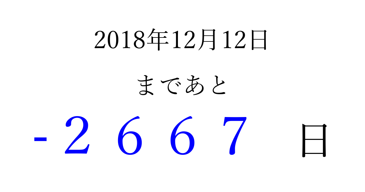 2018年12月12日(水)は もう 0000 日過ぎました 追加すると、トップページからすぐ選べるようになります ※2026/04/01現在の結果です。 最新の状態に更新する ↓シェアして、タイムライン上にカウントダウンを表示しよう!↓ 📤 この結果を共有する Tweet シェア Threads Bluesky 別の日付でカウントダウン 2018年12月のカレンダー このページをブックマークに追加すると、いつでもカウントダウンを確認できます。 (PC: Ctrl+D / Mac: ⌘+D) hitome-notes.comでは以下のページも運営しています。 指定日と期間から日付を計算 | ガチャ確率計算・シミュレーション | プライバシー・ポリシー 運営者:Avocado