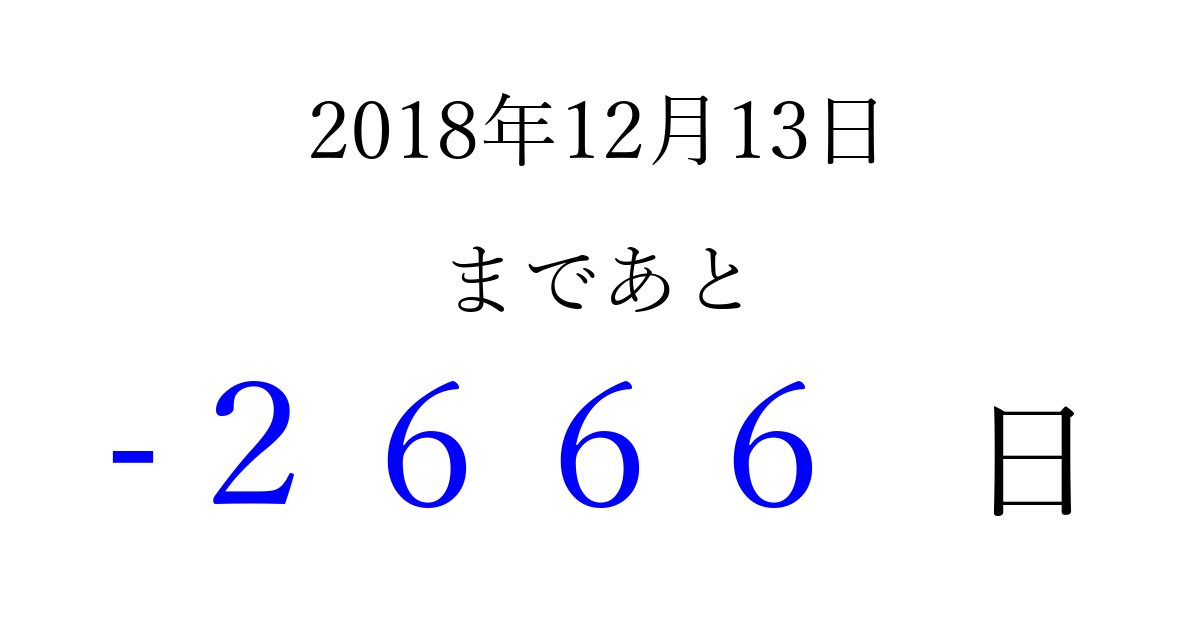 2018年12月13日(木)は もう 0000 日過ぎました 追加すると、トップページからすぐ選べるようになります ※2026/04/01現在の結果です。 最新の状態に更新する ↓シェアして、タイムライン上にカウントダウンを表示しよう!↓ 📤 この結果を共有する Tweet シェア Threads Bluesky 別の日付でカウントダウン 2018年12月のカレンダー このページをブックマークに追加すると、いつでもカウントダウンを確認できます。 (PC: Ctrl+D / Mac: ⌘+D) hitome-notes.comでは以下のページも運営しています。 指定日と期間から日付を計算 | ガチャ確率計算・シミュレーション | プライバシー・ポリシー 運営者:Avocado