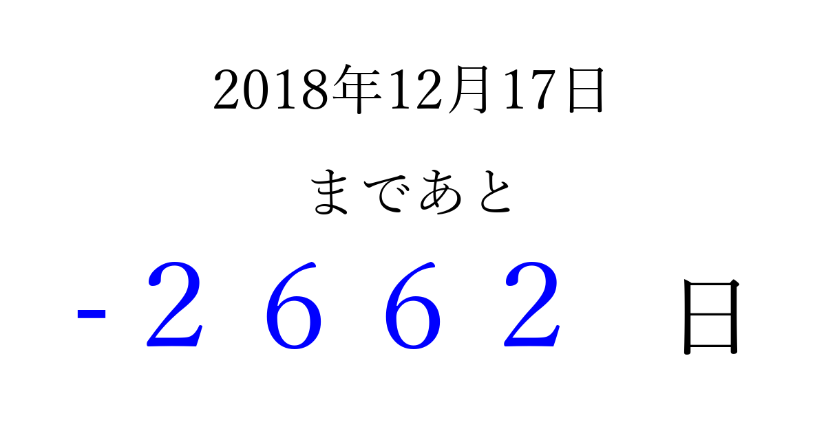 2018年12月17日(月)は もう 0000 日過ぎました 追加すると、トップページからすぐ選べるようになります ※2026/04/01現在の結果です。 最新の状態に更新する ↓シェアして、タイムライン上にカウントダウンを表示しよう!↓ 📤 この結果を共有する Tweet シェア Threads Bluesky 別の日付でカウントダウン 2018年12月のカレンダー このページをブックマークに追加すると、いつでもカウントダウンを確認できます。 (PC: Ctrl+D / Mac: ⌘+D) hitome-notes.comでは以下のページも運営しています。 指定日と期間から日付を計算 | ガチャ確率計算・シミュレーション | プライバシー・ポリシー 運営者:Avocado