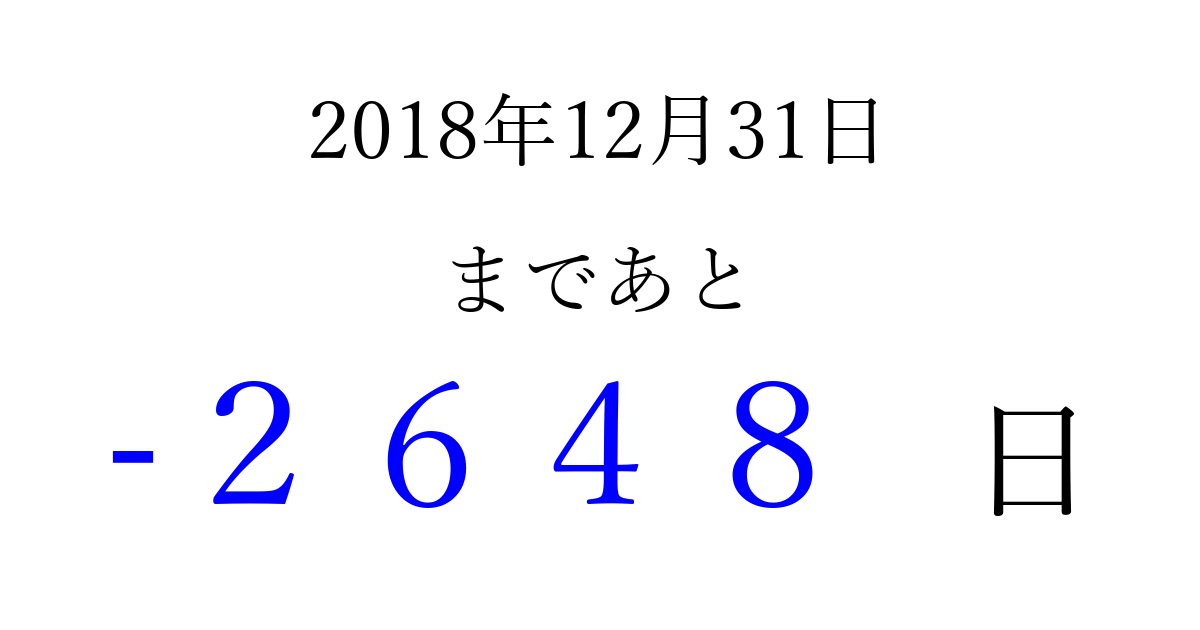 2018年12月31日(月)は もう 0000 日過ぎました 追加すると、トップページからすぐ選べるようになります ※2026/04/01現在の結果です。 最新の状態に更新する ↓シェアして、タイムライン上にカウントダウンを表示しよう!↓ 📤 この結果を共有する Tweet シェア Threads Bluesky この日は何の日?2018年年末(大晦日) 別の日付でカウントダウン 2018年12月のカレンダー このページをブックマークに追加すると、いつでもカウントダウンを確認できます。 (PC: Ctrl+D / Mac: ⌘+D) hitome-notes.comでは以下のページも運営しています。 指定日と期間から日付を計算 | ガチャ確率計算・シミュレーション | プライバシー・ポリシー 運営者:Avocado