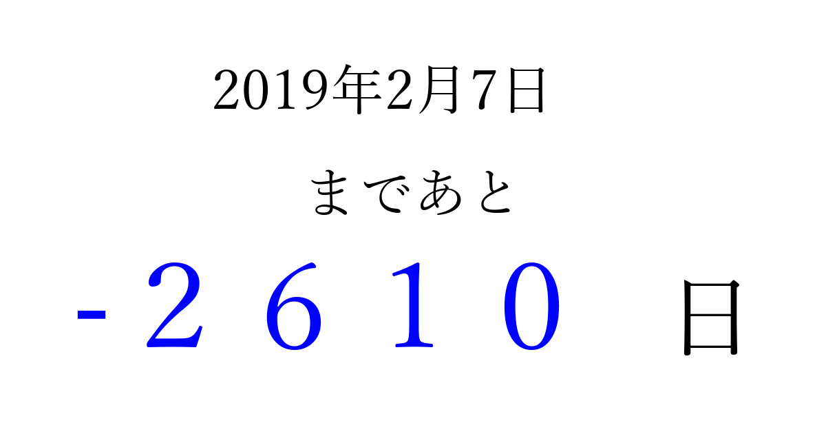 2019年2月7日(木)は もう 0000 日過ぎました 追加すると、トップページからすぐ選べるようになります ※2026/04/01現在の結果です。 最新の状態に更新する ↓シェアして、タイムライン上にカウントダウンを表示しよう!↓ 📤 この結果を共有する Tweet シェア Threads Bluesky 別の日付でカウントダウン 2019年2月のカレンダー このページをブックマークに追加すると、いつでもカウントダウンを確認できます。 (PC: Ctrl+D / Mac: ⌘+D) hitome-notes.comでは以下のページも運営しています。 指定日と期間から日付を計算 | ガチャ確率計算・シミュレーション | プライバシー・ポリシー 運営者:Avocado