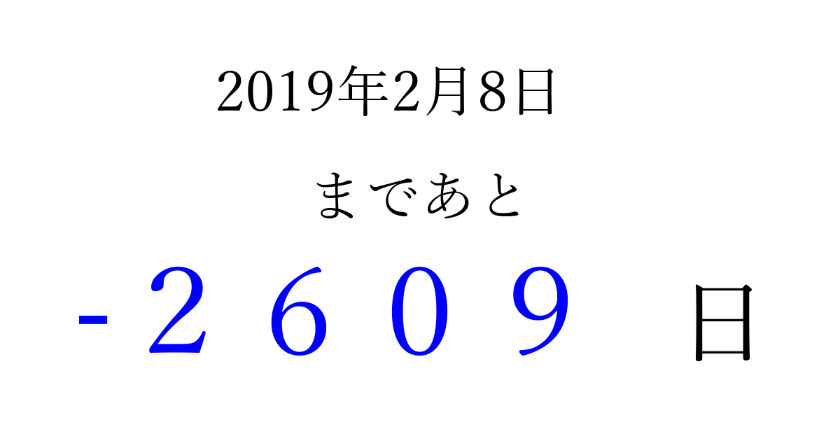 2019年2月8日(金)は もう 0000 日過ぎました 追加すると、トップページからすぐ選べるようになります ※2026/04/01現在の結果です。 最新の状態に更新する ↓シェアして、タイムライン上にカウントダウンを表示しよう!↓ 📤 この結果を共有する Tweet シェア Threads Bluesky 別の日付でカウントダウン 2019年2月のカレンダー このページをブックマークに追加すると、いつでもカウントダウンを確認できます。 (PC: Ctrl+D / Mac: ⌘+D) hitome-notes.comでは以下のページも運営しています。 指定日と期間から日付を計算 | ガチャ確率計算・シミュレーション | プライバシー・ポリシー 運営者:Avocado