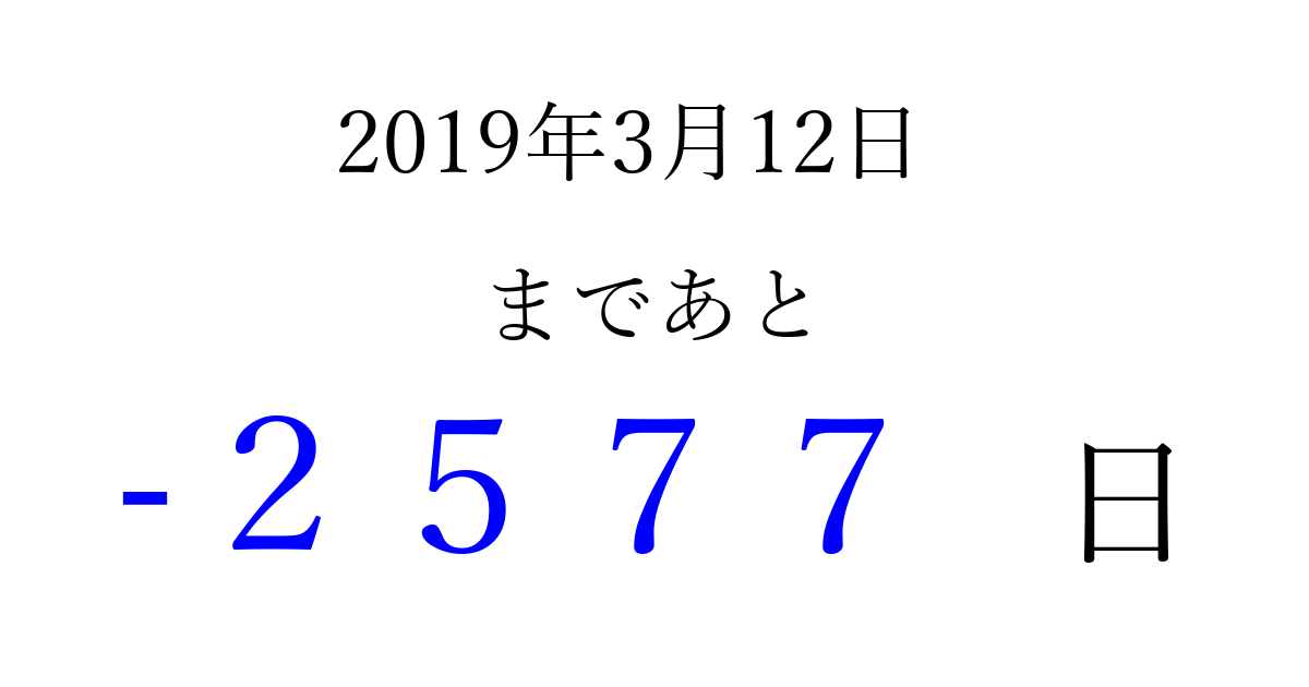 2019年3月12日(火)は もう 0000 日過ぎました 追加すると、トップページからすぐ選べるようになります ※2026/04/01現在の結果です。 最新の状態に更新する ↓シェアして、タイムライン上にカウントダウンを表示しよう!↓ 📤 この結果を共有する Tweet シェア Threads Bluesky 別の日付でカウントダウン 2019年3月のカレンダー このページをブックマークに追加すると、いつでもカウントダウンを確認できます。 (PC: Ctrl+D / Mac: ⌘+D) hitome-notes.comでは以下のページも運営しています。 指定日と期間から日付を計算 | ガチャ確率計算・シミュレーション | プライバシー・ポリシー 運営者:Avocado