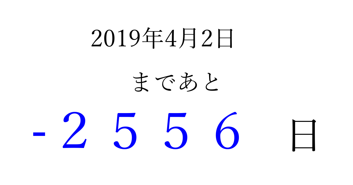 2019年4月2日(火)は もう 0000 日過ぎました 追加すると、トップページからすぐ選べるようになります ※2026/04/01現在の結果です。 最新の状態に更新する ↓シェアして、タイムライン上にカウントダウンを表示しよう!↓ 📤 この結果を共有する Tweet シェア Threads Bluesky 別の日付でカウントダウン 2019年4月のカレンダー このページをブックマークに追加すると、いつでもカウントダウンを確認できます。 (PC: Ctrl+D / Mac: ⌘+D) hitome-notes.comでは以下のページも運営しています。 指定日と期間から日付を計算 | ガチャ確率計算・シミュレーション | プライバシー・ポリシー 運営者:Avocado