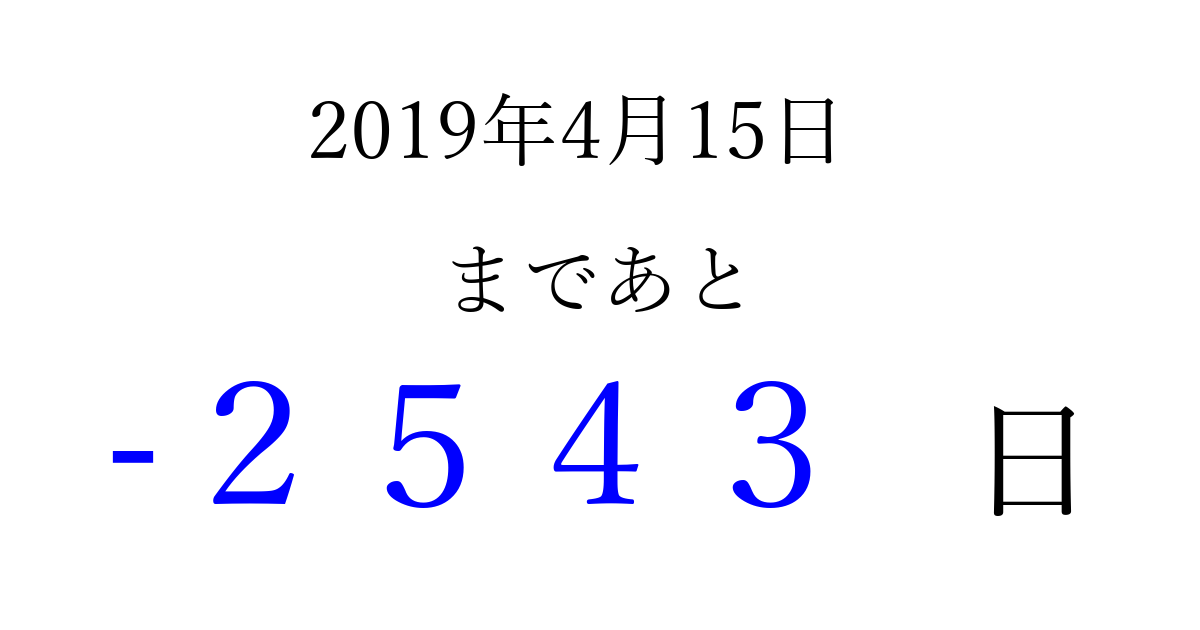 2019年4月15日(月)は もう 0000 日過ぎました 追加すると、トップページからすぐ選べるようになります ※2026/04/01現在の結果です。 最新の状態に更新する ↓シェアして、タイムライン上にカウントダウンを表示しよう!↓ 📤 この結果を共有する Tweet シェア Threads Bluesky 別の日付でカウントダウン 2019年4月のカレンダー このページをブックマークに追加すると、いつでもカウントダウンを確認できます。 (PC: Ctrl+D / Mac: ⌘+D) hitome-notes.comでは以下のページも運営しています。 指定日と期間から日付を計算 | ガチャ確率計算・シミュレーション | プライバシー・ポリシー 運営者:Avocado
