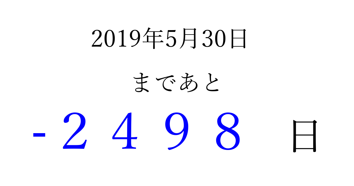 2019年5月30日(木)は もう 0000 日過ぎました 追加すると、トップページからすぐ選べるようになります ※2026/04/01現在の結果です。 最新の状態に更新する ↓シェアして、タイムライン上にカウントダウンを表示しよう!↓ 📤 この結果を共有する Tweet シェア Threads Bluesky 別の日付でカウントダウン 2019年5月のカレンダー このページをブックマークに追加すると、いつでもカウントダウンを確認できます。 (PC: Ctrl+D / Mac: ⌘+D) hitome-notes.comでは以下のページも運営しています。 指定日と期間から日付を計算 | ガチャ確率計算・シミュレーション | プライバシー・ポリシー 運営者:Avocado