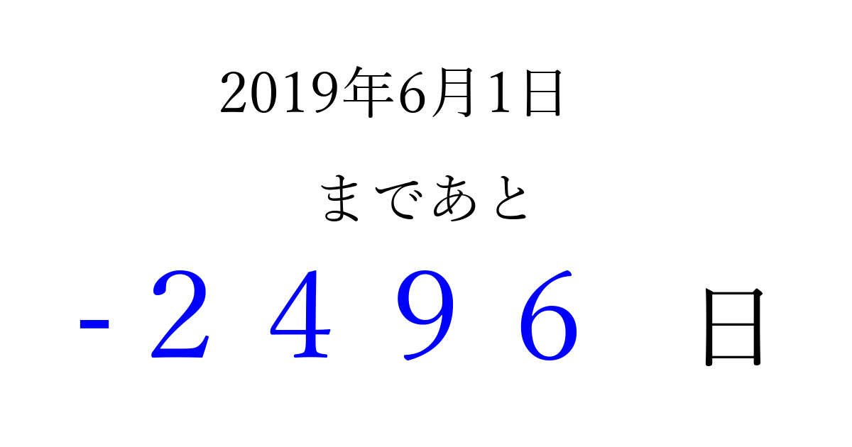2019年6月1日(土)は もう 0000 日過ぎました 追加すると、トップページからすぐ選べるようになります ※2026/04/01現在の結果です。 最新の状態に更新する ↓シェアして、タイムライン上にカウントダウンを表示しよう!↓ 📤 この結果を共有する Tweet シェア Threads Bluesky 別の日付でカウントダウン 2019年6月のカレンダー このページをブックマークに追加すると、いつでもカウントダウンを確認できます。 (PC: Ctrl+D / Mac: ⌘+D) hitome-notes.comでは以下のページも運営しています。 指定日と期間から日付を計算 | ガチャ確率計算・シミュレーション | プライバシー・ポリシー 運営者:Avocado