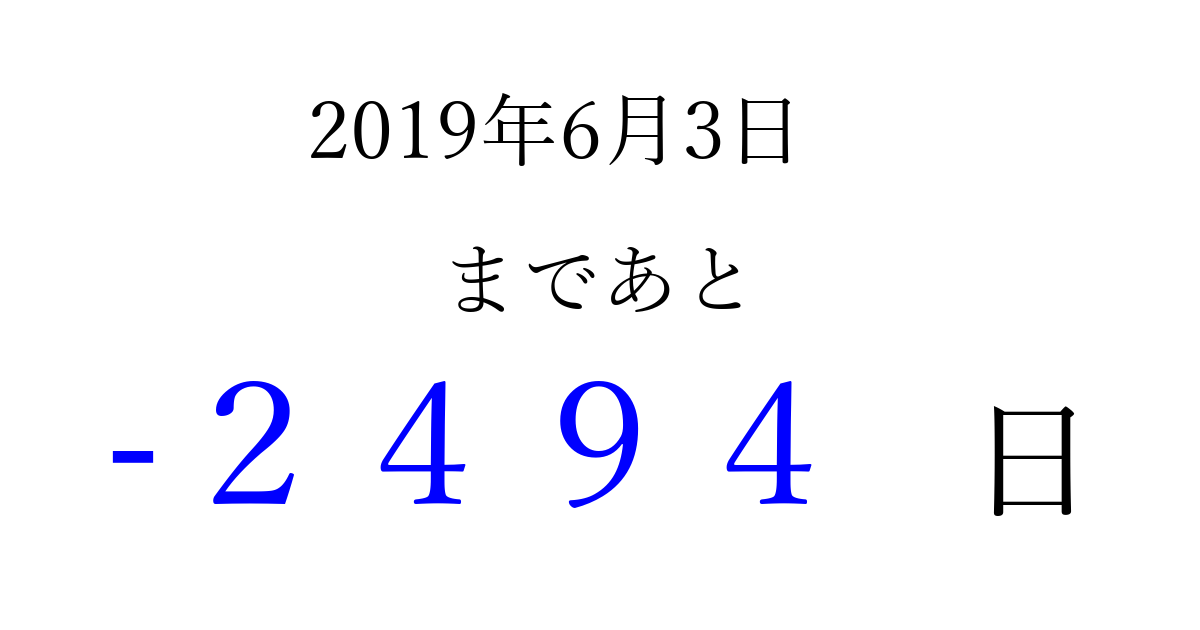 2019年6月3日(月)は もう 0000 日過ぎました 追加すると、トップページからすぐ選べるようになります ※2026/04/01現在の結果です。 最新の状態に更新する ↓シェアして、タイムライン上にカウントダウンを表示しよう!↓ 📤 この結果を共有する Tweet シェア Threads Bluesky 別の日付でカウントダウン 2019年6月のカレンダー このページをブックマークに追加すると、いつでもカウントダウンを確認できます。 (PC: Ctrl+D / Mac: ⌘+D) hitome-notes.comでは以下のページも運営しています。 指定日と期間から日付を計算 | ガチャ確率計算・シミュレーション | プライバシー・ポリシー 運営者:Avocado