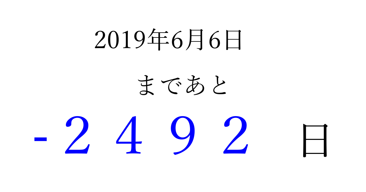 2019年6月6日(木)は もう 0000 日過ぎました 追加すると、トップページからすぐ選べるようになります ※2026/04/02現在の結果です。 最新の状態に更新する ↓シェアして、タイムライン上にカウントダウンを表示しよう!↓ 📤 この結果を共有する Tweet シェア Threads Bluesky 別の日付でカウントダウン 2019年6月のカレンダー このページをブックマークに追加すると、いつでもカウントダウンを確認できます。 (PC: Ctrl+D / Mac: ⌘+D) hitome-notes.comでは以下のページも運営しています。 指定日と期間から日付を計算 | ガチャ確率計算・シミュレーション | プライバシー・ポリシー 運営者:Avocado