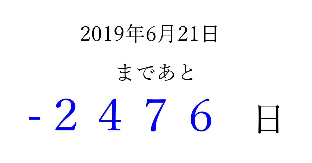2019年6月21日(金)は もう 0000 日過ぎました 追加すると、トップページからすぐ選べるようになります ※2026/04/01現在の結果です。 最新の状態に更新する ↓シェアして、タイムライン上にカウントダウンを表示しよう!↓ 📤 この結果を共有する Tweet シェア Threads Bluesky 別の日付でカウントダウン 2019年6月のカレンダー このページをブックマークに追加すると、いつでもカウントダウンを確認できます。 (PC: Ctrl+D / Mac: ⌘+D) hitome-notes.comでは以下のページも運営しています。 指定日と期間から日付を計算 | ガチャ確率計算・シミュレーション | プライバシー・ポリシー 運営者:Avocado