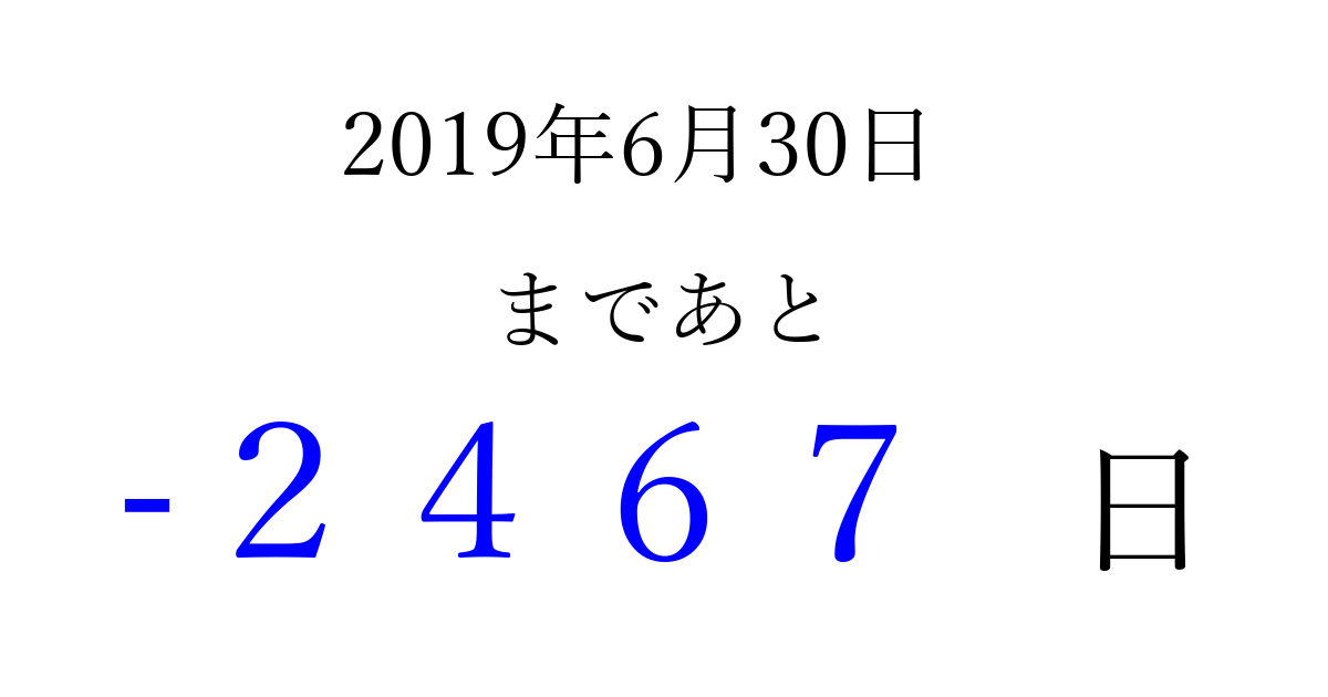2019年6月30日(日)は もう 0000 日過ぎました 追加すると、トップページからすぐ選べるようになります ※2026/04/01現在の結果です。 最新の状態に更新する ↓シェアして、タイムライン上にカウントダウンを表示しよう!↓ 📤 この結果を共有する Tweet シェア Threads Bluesky 別の日付でカウントダウン 2019年6月のカレンダー このページをブックマークに追加すると、いつでもカウントダウンを確認できます。 (PC: Ctrl+D / Mac: ⌘+D) hitome-notes.comでは以下のページも運営しています。 指定日と期間から日付を計算 | ガチャ確率計算・シミュレーション | プライバシー・ポリシー 運営者:Avocado