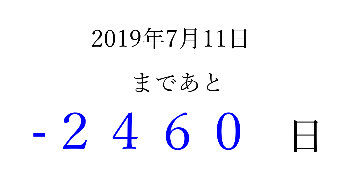 2019年7月11日(木)は もう 0000 日過ぎました 追加すると、トップページからすぐ選べるようになります ※2026/04/05現在の結果です。 最新の状態に更新する ↓シェアして、タイムライン上にカウントダウンを表示しよう!↓ 📤 この結果を共有する Tweet シェア Threads Bluesky 別の日付でカウントダウン 2019年7月のカレンダー このページをブックマークに追加すると、いつでもカウントダウンを確認できます。 (PC: Ctrl+D / Mac: ⌘+D) hitome-notes.comでは以下のページも運営しています。 指定日と期間から日付を計算 | ガチャ確率計算・シミュレーション | プライバシー・ポリシー 運営者:Avocado