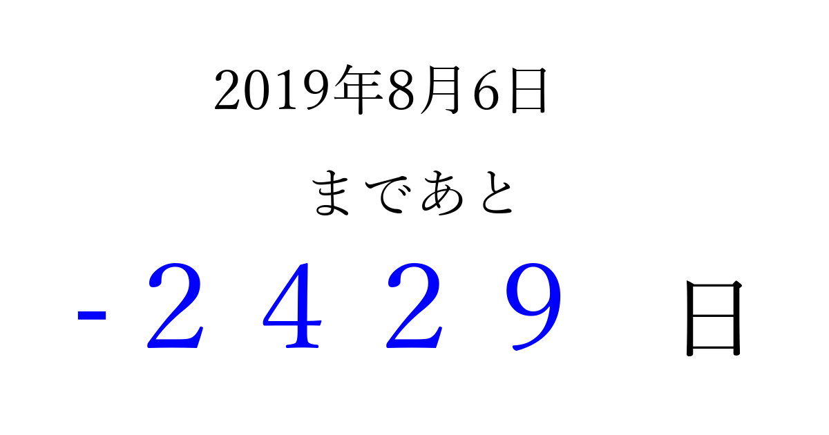 2019年8月6日(火)は もう 0000 日過ぎました 追加すると、トップページからすぐ選べるようになります ※2026/03/31現在の結果です。 最新の状態に更新する ↓シェアして、タイムライン上にカウントダウンを表示しよう!↓ 📤 この結果を共有する Tweet シェア Threads Bluesky 別の日付でカウントダウン 2019年8月のカレンダー このページをブックマークに追加すると、いつでもカウントダウンを確認できます。 (PC: Ctrl+D / Mac: ⌘+D) hitome-notes.comでは以下のページも運営しています。 指定日と期間から日付を計算 | ガチャ確率計算・シミュレーション | プライバシー・ポリシー 運営者:Avocado