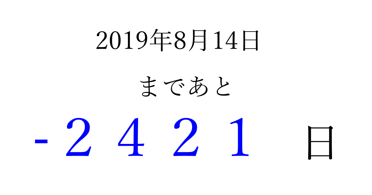 2019年8月14日(水)は もう 0000 日過ぎました 追加すると、トップページからすぐ選べるようになります ※2026/03/31現在の結果です。 最新の状態に更新する ↓シェアして、タイムライン上にカウントダウンを表示しよう!↓ 📤 この結果を共有する Tweet シェア Threads Bluesky 別の日付でカウントダウン 2019年8月のカレンダー このページをブックマークに追加すると、いつでもカウントダウンを確認できます。 (PC: Ctrl+D / Mac: ⌘+D) hitome-notes.comでは以下のページも運営しています。 指定日と期間から日付を計算 | ガチャ確率計算・シミュレーション | プライバシー・ポリシー 運営者:Avocado