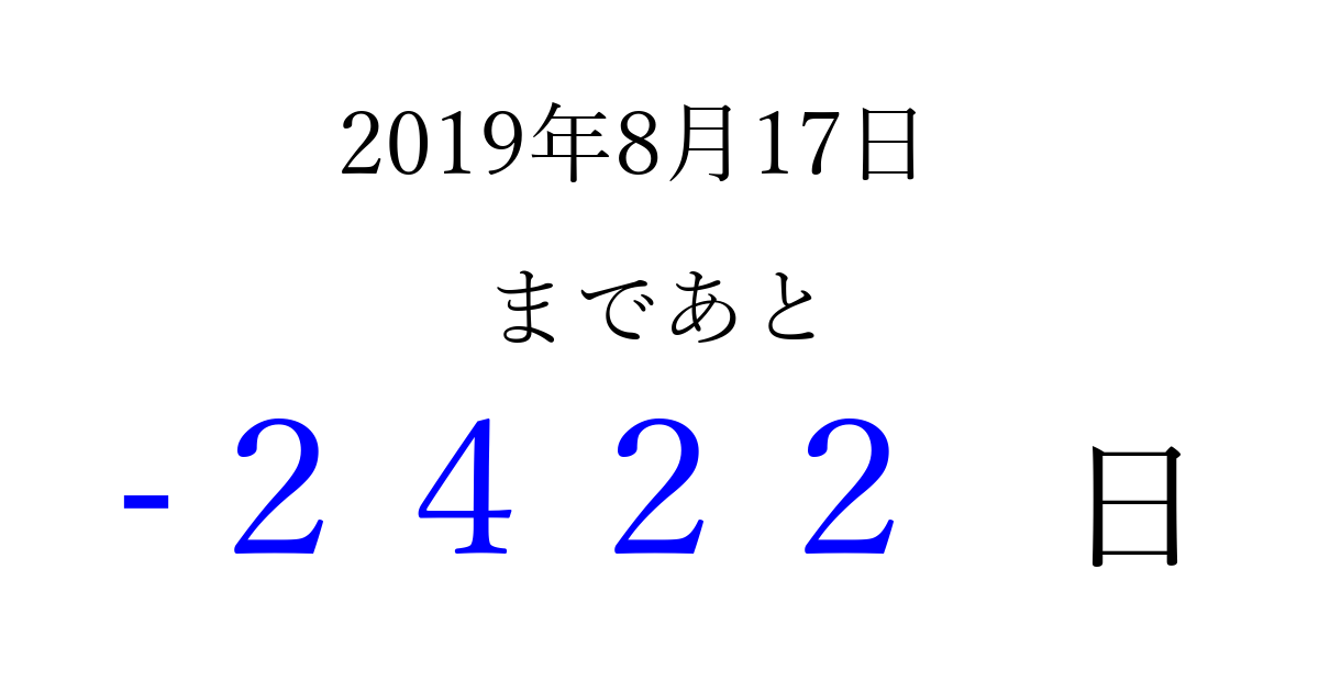 2019年8月17日(土)は もう 0000 日過ぎました 追加すると、トップページからすぐ選べるようになります ※2026/04/04現在の結果です。 最新の状態に更新する ↓シェアして、タイムライン上にカウントダウンを表示しよう!↓ 📤 この結果を共有する Tweet シェア Threads Bluesky 別の日付でカウントダウン 2019年8月のカレンダー このページをブックマークに追加すると、いつでもカウントダウンを確認できます。 (PC: Ctrl+D / Mac: ⌘+D) hitome-notes.comでは以下のページも運営しています。 指定日と期間から日付を計算 | ガチャ確率計算・シミュレーション | プライバシー・ポリシー 運営者:Avocado