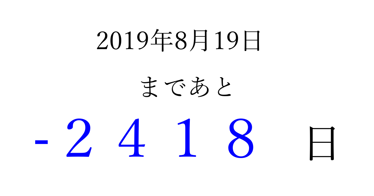 2019年8月19日(月)は もう 0000 日過ぎました 追加すると、トップページからすぐ選べるようになります ※2026/04/02現在の結果です。 最新の状態に更新する ↓シェアして、タイムライン上にカウントダウンを表示しよう!↓ 📤 この結果を共有する Tweet シェア Threads Bluesky 別の日付でカウントダウン 2019年8月のカレンダー このページをブックマークに追加すると、いつでもカウントダウンを確認できます。 (PC: Ctrl+D / Mac: ⌘+D) hitome-notes.comでは以下のページも運営しています。 指定日と期間から日付を計算 | ガチャ確率計算・シミュレーション | プライバシー・ポリシー 運営者:Avocado