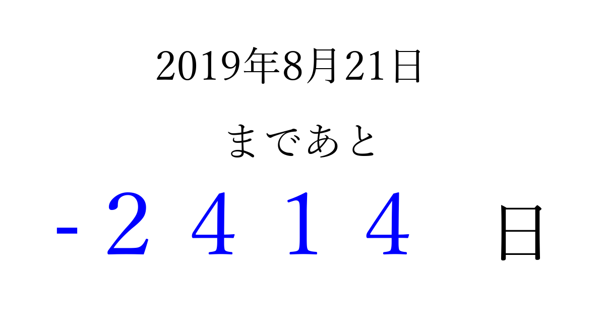 2019年8月21日(水)は もう 0000 日過ぎました 追加すると、トップページからすぐ選べるようになります ※2026/03/31現在の結果です。 最新の状態に更新する ↓シェアして、タイムライン上にカウントダウンを表示しよう!↓ 📤 この結果を共有する Tweet シェア Threads Bluesky 別の日付でカウントダウン 2019年8月のカレンダー このページをブックマークに追加すると、いつでもカウントダウンを確認できます。 (PC: Ctrl+D / Mac: ⌘+D) hitome-notes.comでは以下のページも運営しています。 指定日と期間から日付を計算 | ガチャ確率計算・シミュレーション | プライバシー・ポリシー 運営者:Avocado