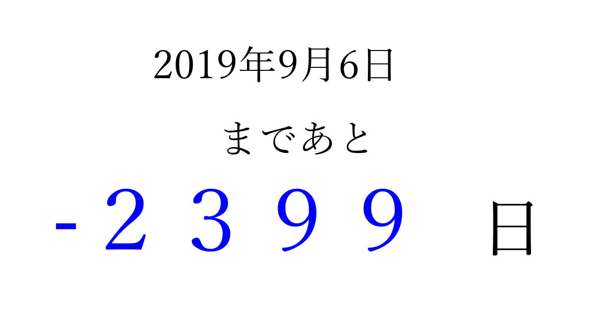 2019年9月6日(金)は もう 0000 日過ぎました 追加すると、トップページからすぐ選べるようになります ※2026/04/01現在の結果です。 最新の状態に更新する ↓シェアして、タイムライン上にカウントダウンを表示しよう!↓ 📤 この結果を共有する Tweet シェア Threads Bluesky 別の日付でカウントダウン 2019年9月のカレンダー このページをブックマークに追加すると、いつでもカウントダウンを確認できます。 (PC: Ctrl+D / Mac: ⌘+D) hitome-notes.comでは以下のページも運営しています。 指定日と期間から日付を計算 | ガチャ確率計算・シミュレーション | プライバシー・ポリシー 運営者:Avocado