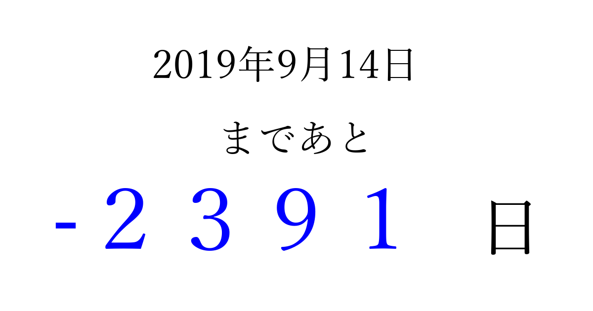 2019年9月14日(土)は もう 0000 日過ぎました 追加すると、トップページからすぐ選べるようになります ※2026/04/01現在の結果です。 最新の状態に更新する ↓シェアして、タイムライン上にカウントダウンを表示しよう!↓ 📤 この結果を共有する Tweet シェア Threads Bluesky 別の日付でカウントダウン 2019年9月のカレンダー このページをブックマークに追加すると、いつでもカウントダウンを確認できます。 (PC: Ctrl+D / Mac: ⌘+D) hitome-notes.comでは以下のページも運営しています。 指定日と期間から日付を計算 | ガチャ確率計算・シミュレーション | プライバシー・ポリシー 運営者:Avocado