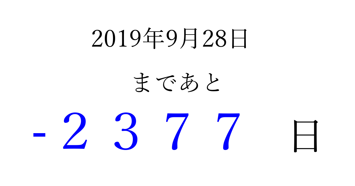 2019年9月28日(土)は もう 0000 日過ぎました 追加すると、トップページからすぐ選べるようになります ※2026/04/01現在の結果です。 最新の状態に更新する ↓シェアして、タイムライン上にカウントダウンを表示しよう!↓ 📤 この結果を共有する Tweet シェア Threads Bluesky 別の日付でカウントダウン 2019年9月のカレンダー このページをブックマークに追加すると、いつでもカウントダウンを確認できます。 (PC: Ctrl+D / Mac: ⌘+D) hitome-notes.comでは以下のページも運営しています。 指定日と期間から日付を計算 | ガチャ確率計算・シミュレーション | プライバシー・ポリシー 運営者:Avocado