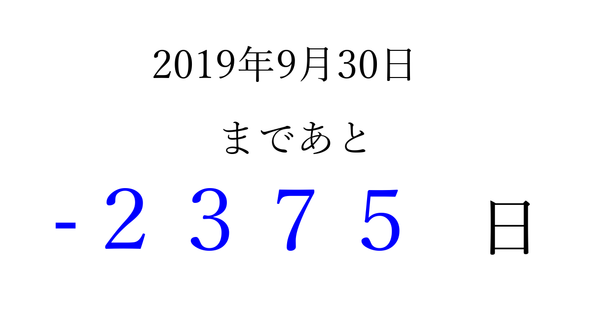 2019年9月30日(月)は もう 0000 日過ぎました 追加すると、トップページからすぐ選べるようになります ※2026/04/01現在の結果です。 最新の状態に更新する ↓シェアして、タイムライン上にカウントダウンを表示しよう!↓ 📤 この結果を共有する Tweet シェア Threads Bluesky 別の日付でカウントダウン 2019年9月のカレンダー このページをブックマークに追加すると、いつでもカウントダウンを確認できます。 (PC: Ctrl+D / Mac: ⌘+D) hitome-notes.comでは以下のページも運営しています。 指定日と期間から日付を計算 | ガチャ確率計算・シミュレーション | プライバシー・ポリシー 運営者:Avocado