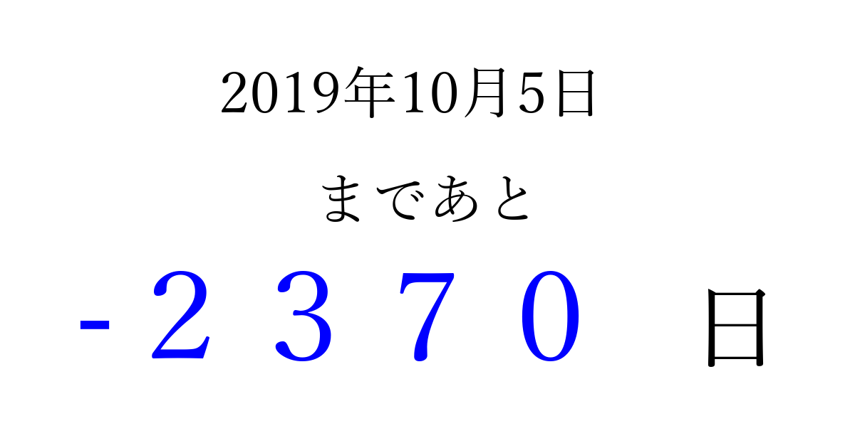 2019年10月5日(土)は もう 0000 日過ぎました 追加すると、トップページからすぐ選べるようになります ※2026/04/01現在の結果です。 最新の状態に更新する ↓シェアして、タイムライン上にカウントダウンを表示しよう!↓ 📤 この結果を共有する Tweet シェア Threads Bluesky 別の日付でカウントダウン 2019年10月のカレンダー このページをブックマークに追加すると、いつでもカウントダウンを確認できます。 (PC: Ctrl+D / Mac: ⌘+D) hitome-notes.comでは以下のページも運営しています。 指定日と期間から日付を計算 | ガチャ確率計算・シミュレーション | プライバシー・ポリシー 運営者:Avocado