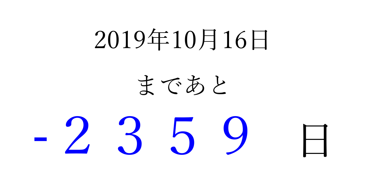 2019年10月16日(水)は もう 0000 日過ぎました 追加すると、トップページからすぐ選べるようになります ※2026/04/01現在の結果です。 最新の状態に更新する ↓シェアして、タイムライン上にカウントダウンを表示しよう!↓ 📤 この結果を共有する Tweet シェア Threads Bluesky 別の日付でカウントダウン 2019年10月のカレンダー このページをブックマークに追加すると、いつでもカウントダウンを確認できます。 (PC: Ctrl+D / Mac: ⌘+D) hitome-notes.comでは以下のページも運営しています。 指定日と期間から日付を計算 | ガチャ確率計算・シミュレーション | プライバシー・ポリシー 運営者:Avocado