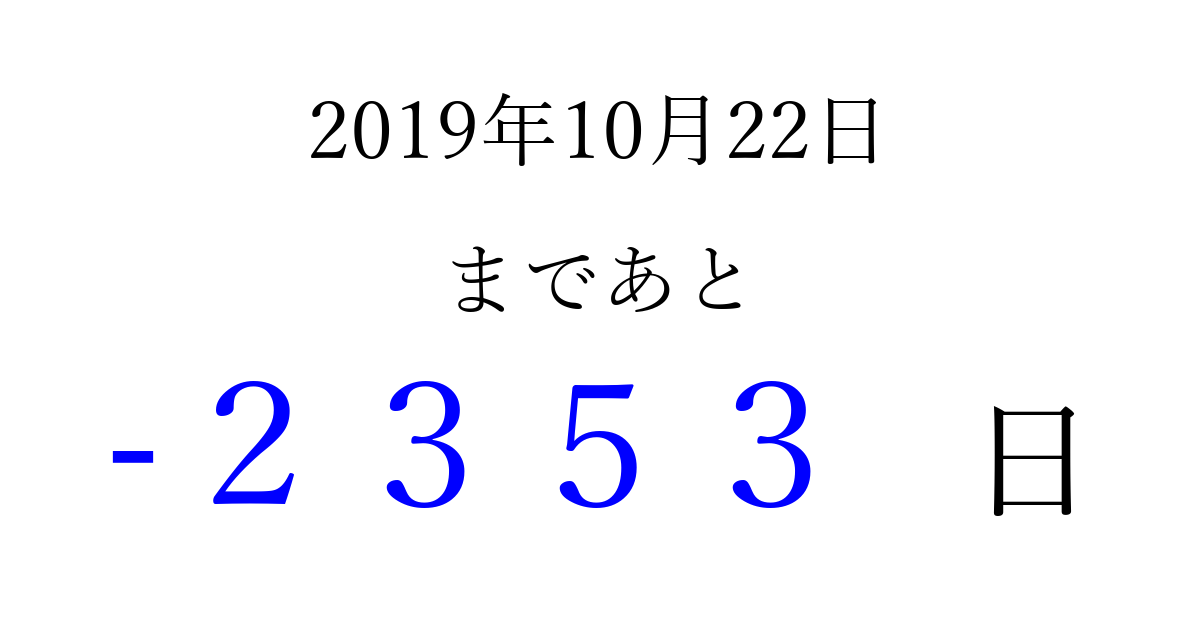 2019年10月22日(火)は もう 0000 日過ぎました 追加すると、トップページからすぐ選べるようになります ※2026/04/01現在の結果です。 最新の状態に更新する ↓シェアして、タイムライン上にカウントダウンを表示しよう!↓ 📤 この結果を共有する Tweet シェア Threads Bluesky この日は何の日?即位礼正殿の儀の行われる日 別の日付でカウントダウン 2019年10月のカレンダー このページをブックマークに追加すると、いつでもカウントダウンを確認できます。 (PC: Ctrl+D / Mac: ⌘+D) hitome-notes.comでは以下のページも運営しています。 指定日と期間から日付を計算 | ガチャ確率計算・シミュレーション | プライバシー・ポリシー 運営者:Avocado