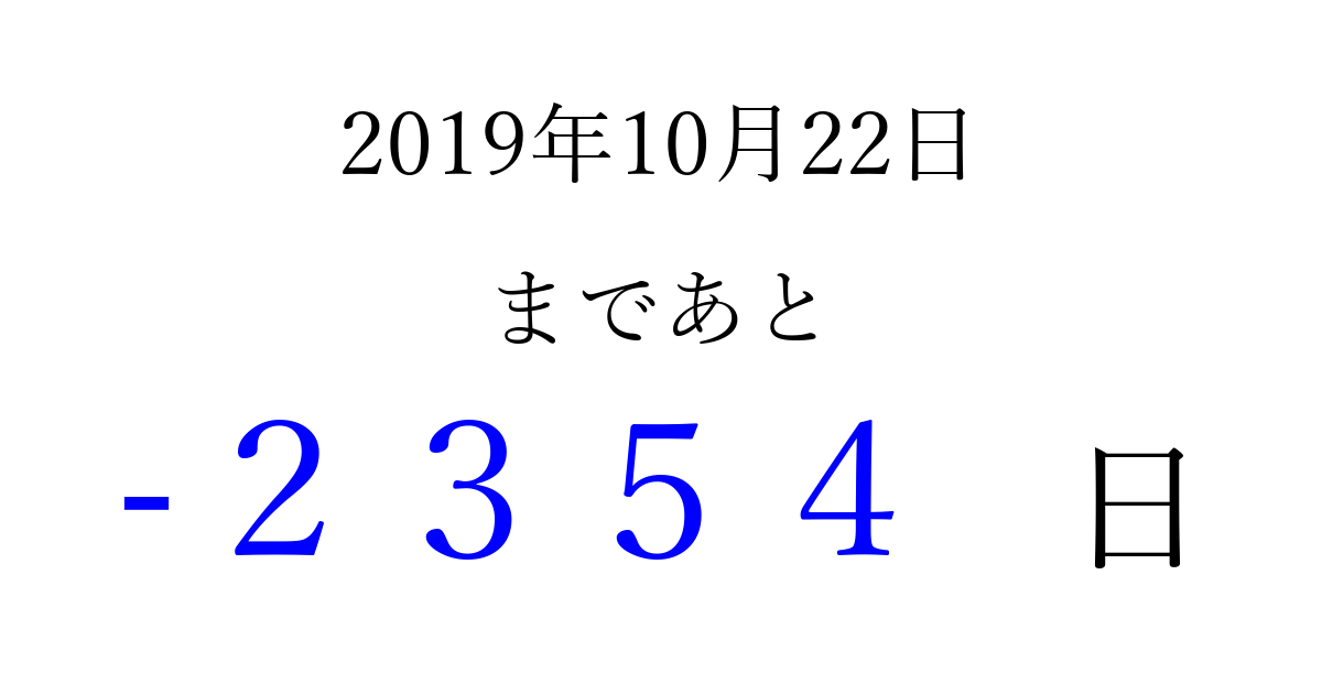2019年10月22日(火)は もう 0000 日過ぎました 追加すると、トップページからすぐ選べるようになります ※2026/04/02現在の結果です。 最新の状態に更新する ↓シェアして、タイムライン上にカウントダウンを表示しよう!↓ 📤 この結果を共有する Tweet シェア Threads Bluesky この日は何の日?即位礼正殿の儀の行われる日 別の日付でカウントダウン 2019年10月のカレンダー このページをブックマークに追加すると、いつでもカウントダウンを確認できます。 (PC: Ctrl+D / Mac: ⌘+D) hitome-notes.comでは以下のページも運営しています。 指定日と期間から日付を計算 | ガチャ確率計算・シミュレーション | プライバシー・ポリシー 運営者:Avocado