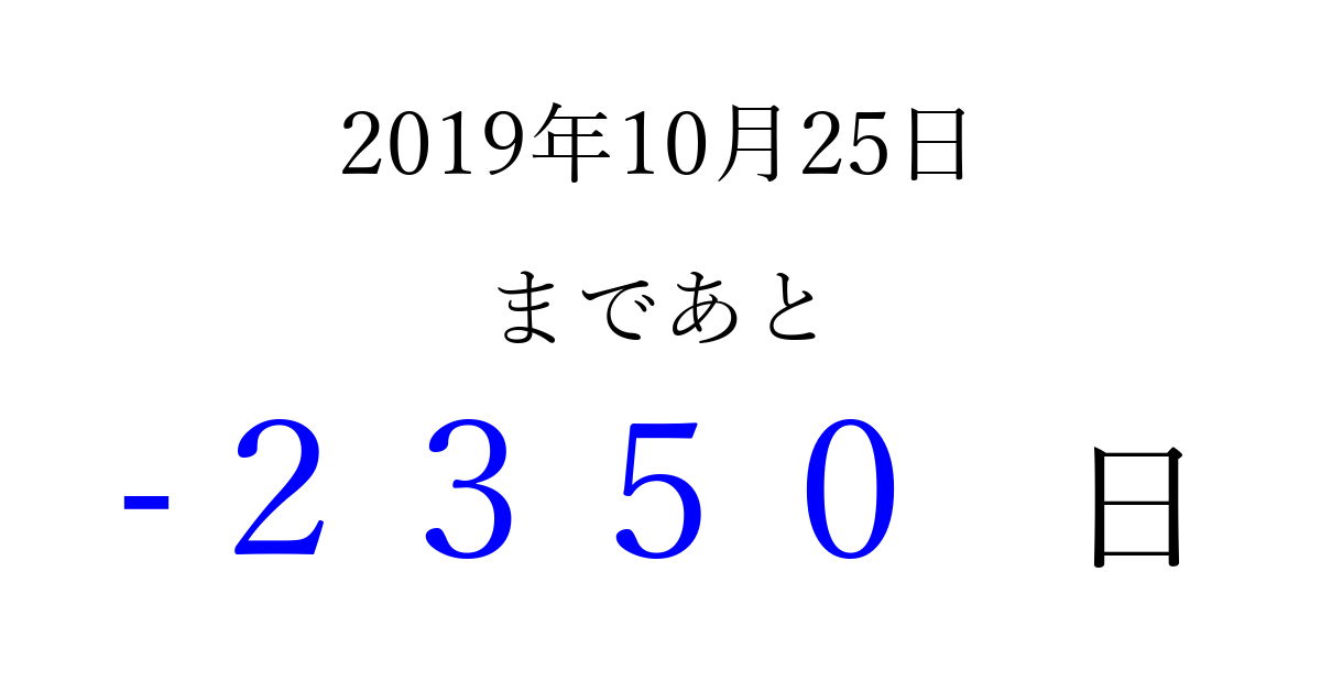 2019年10月25日(金)は もう 0000 日過ぎました 追加すると、トップページからすぐ選べるようになります ※2026/04/01現在の結果です。 最新の状態に更新する ↓シェアして、タイムライン上にカウントダウンを表示しよう!↓ 📤 この結果を共有する Tweet シェア Threads Bluesky 別の日付でカウントダウン 2019年10月のカレンダー このページをブックマークに追加すると、いつでもカウントダウンを確認できます。 (PC: Ctrl+D / Mac: ⌘+D) hitome-notes.comでは以下のページも運営しています。 指定日と期間から日付を計算 | ガチャ確率計算・シミュレーション | プライバシー・ポリシー 運営者:Avocado