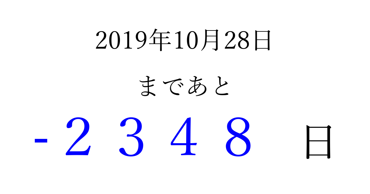 2019年10月28日(月)は もう 0000 日過ぎました 追加すると、トップページからすぐ選べるようになります ※2026/04/02現在の結果です。 最新の状態に更新する ↓シェアして、タイムライン上にカウントダウンを表示しよう!↓ 📤 この結果を共有する Tweet シェア Threads Bluesky 別の日付でカウントダウン 2019年10月のカレンダー このページをブックマークに追加すると、いつでもカウントダウンを確認できます。 (PC: Ctrl+D / Mac: ⌘+D) hitome-notes.comでは以下のページも運営しています。 指定日と期間から日付を計算 | ガチャ確率計算・シミュレーション | プライバシー・ポリシー 運営者:Avocado