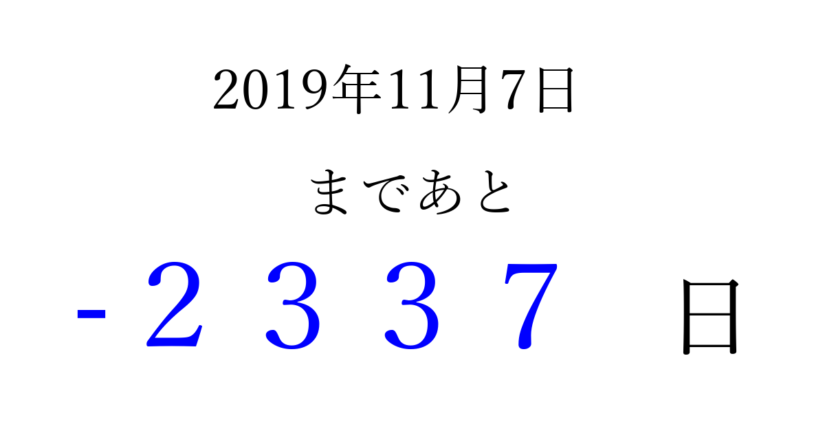 2019年11月7日(木)は もう 0000 日過ぎました 追加すると、トップページからすぐ選べるようになります ※2026/04/01現在の結果です。 最新の状態に更新する ↓シェアして、タイムライン上にカウントダウンを表示しよう!↓ 📤 この結果を共有する Tweet シェア Threads Bluesky 別の日付でカウントダウン 2019年11月のカレンダー このページをブックマークに追加すると、いつでもカウントダウンを確認できます。 (PC: Ctrl+D / Mac: ⌘+D) hitome-notes.comでは以下のページも運営しています。 指定日と期間から日付を計算 | ガチャ確率計算・シミュレーション | プライバシー・ポリシー 運営者:Avocado