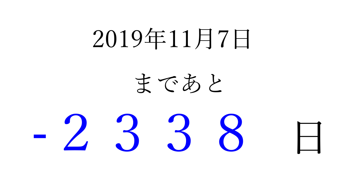 2019年11月7日(木)は もう 0000 日過ぎました 追加すると、トップページからすぐ選べるようになります ※2026/04/02現在の結果です。 最新の状態に更新する ↓シェアして、タイムライン上にカウントダウンを表示しよう!↓ 📤 この結果を共有する Tweet シェア Threads Bluesky 別の日付でカウントダウン 2019年11月のカレンダー このページをブックマークに追加すると、いつでもカウントダウンを確認できます。 (PC: Ctrl+D / Mac: ⌘+D) hitome-notes.comでは以下のページも運営しています。 指定日と期間から日付を計算 | ガチャ確率計算・シミュレーション | プライバシー・ポリシー 運営者:Avocado