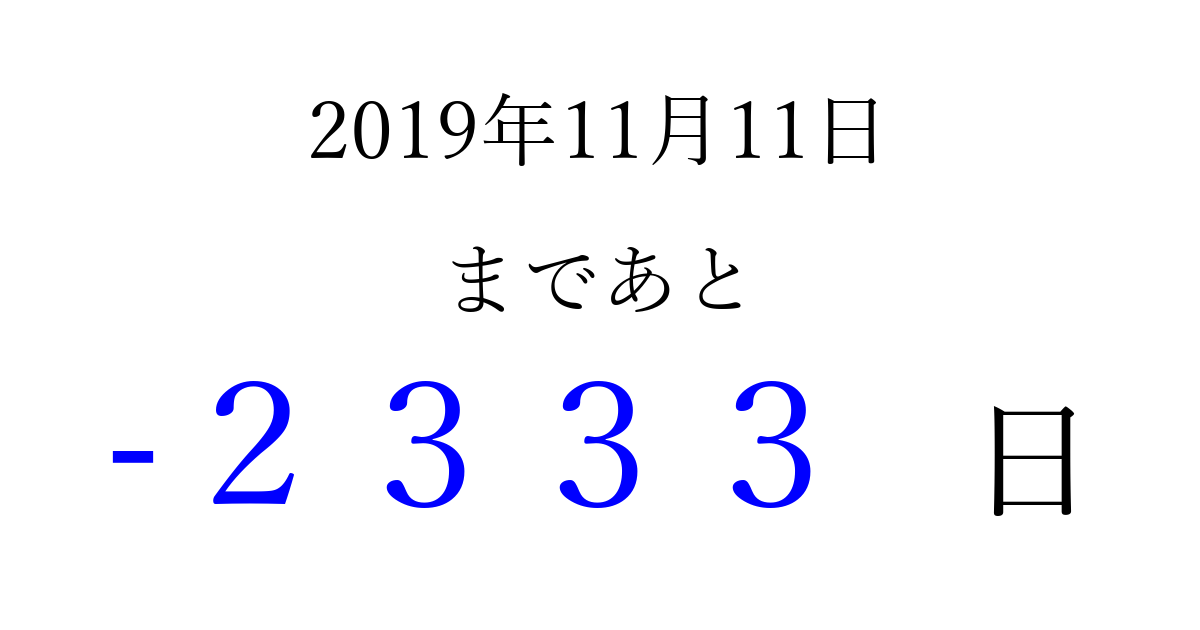 2019年11月11日(月)は もう 0000 日過ぎました 追加すると、トップページからすぐ選べるようになります ※2026/04/01現在の結果です。 最新の状態に更新する ↓シェアして、タイムライン上にカウントダウンを表示しよう!↓ 📤 この結果を共有する Tweet シェア Threads Bluesky 別の日付でカウントダウン 2019年11月のカレンダー このページをブックマークに追加すると、いつでもカウントダウンを確認できます。 (PC: Ctrl+D / Mac: ⌘+D) hitome-notes.comでは以下のページも運営しています。 指定日と期間から日付を計算 | ガチャ確率計算・シミュレーション | プライバシー・ポリシー 運営者:Avocado