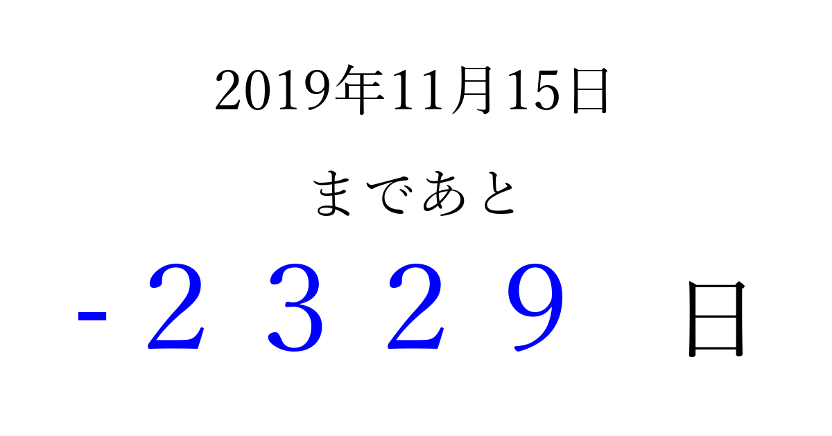 2019年11月15日(金)は もう 0000 日過ぎました 追加すると、トップページからすぐ選べるようになります ※2026/04/01現在の結果です。 最新の状態に更新する ↓シェアして、タイムライン上にカウントダウンを表示しよう!↓ 📤 この結果を共有する Tweet シェア Threads Bluesky 別の日付でカウントダウン 2019年11月のカレンダー このページをブックマークに追加すると、いつでもカウントダウンを確認できます。 (PC: Ctrl+D / Mac: ⌘+D) hitome-notes.comでは以下のページも運営しています。 指定日と期間から日付を計算 | ガチャ確率計算・シミュレーション | プライバシー・ポリシー 運営者:Avocado